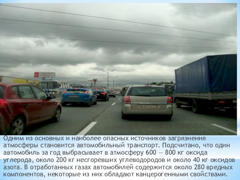Слайд 6Одним из основных и наиболее опасных источников загрязнения атмосферы становится автомобильный