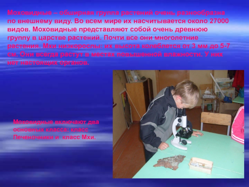 Моховидные включают два основных класса: класс Печеночники и класс Мхи.