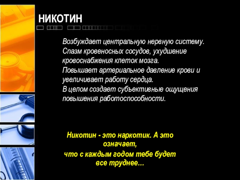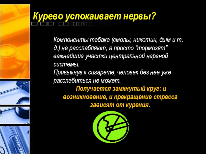 Компоненты табака (смолы, никотин, дым и т.д.) не расслабляют,