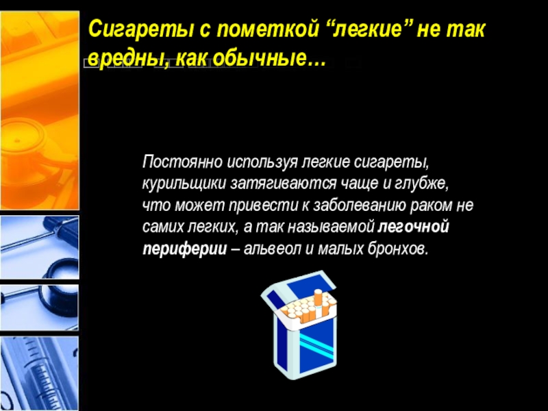 Слайд 27Сигареты с пометкой “легкие” не так вредны, как обычные…