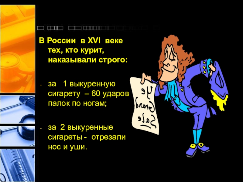 Слайд 7В России в XVI веке тех, кто курит, наказывали строго: