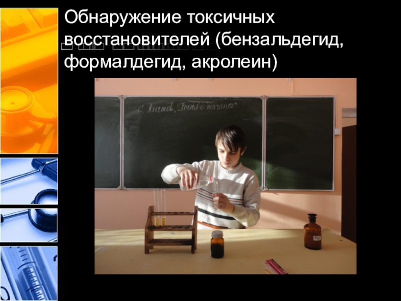 Слайд 48Обнаружение токсичных восстановителей (бензальдегид, формалдегид, акролеин)