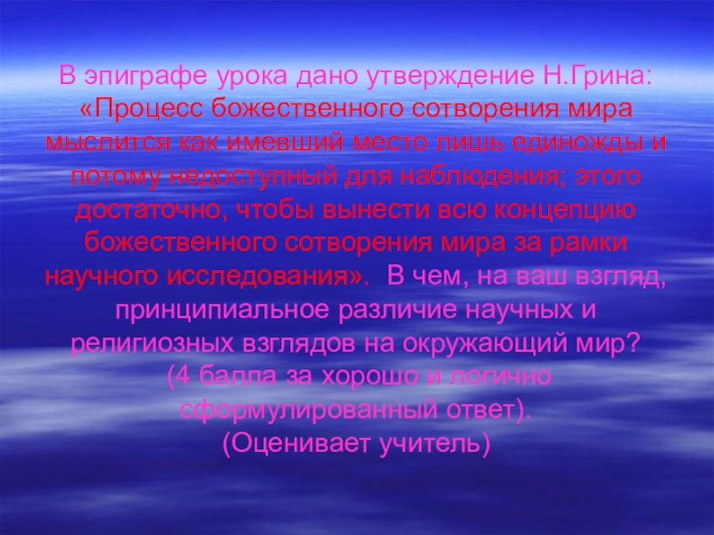 Процесс божественного сотворения мира мыслится как имевший место лишь единожды и потому недоступный для наблюдения; этого достаточно, чтобы вынести всю концепцию божественного сотворения мира за рамки научного исследования.