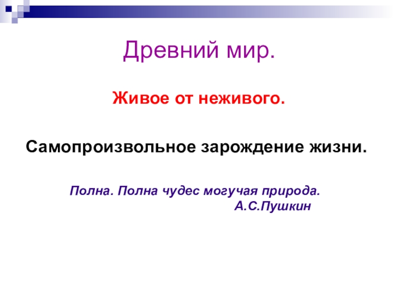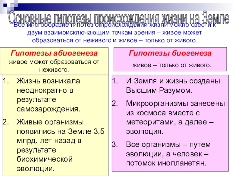 Все многообразие гипотез о происхождении жизни можно свести к двум взаимоисключающим точкам зрения – живое может образоваться от неживого и живое – только от живого.