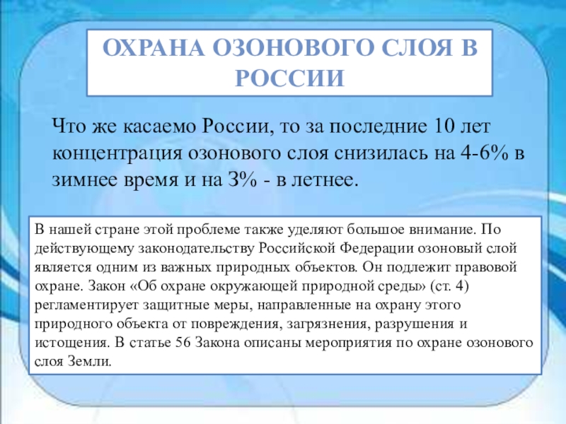 В нашей стране этой проблеме также уделяют большое внимание. По действующему законодательству Российской Федерации озоновый слой является одним из важных природных объектов. Он подлежит правовой охране. Закон «Об охране окружающей природной среды» (ст. 4) регламентирует защитные меры, направленные на охрану этого природного объекта от повреждения, загрязнения, разрушения и истощения. В статье 56 Закона описаны мероприятия по охране озонового слоя Земли.