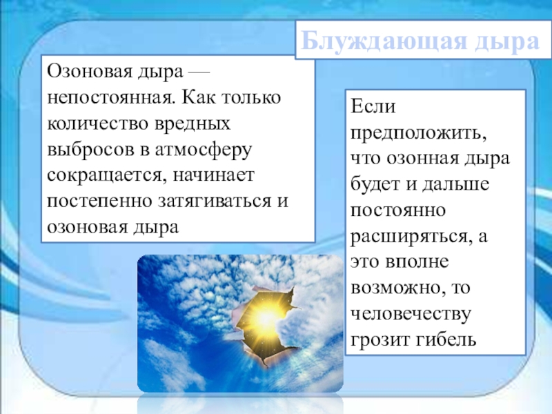 Если предположить, что озонная дыра будет и дальше постоянно расширяться, а это вполне возможно, то человечеству грозит гибель