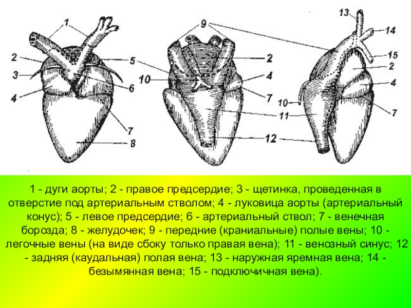 проведенная в отверстие под артериальным стволом; 4 - луковица аорты (артериальный конус); 5 - левое предсердие; 6 - артериальный ствол; 7 - венечная борозда; 8 - желудочек; 9 - передние (краниальные) полые вены; 10 - легочные вены (на виде сбоку только правая вена); 11 - венозный синус; 12 - задняя (каудальная) полая вена; 13 - наружная яремная вена; 14 - безымянная вена; 15 - подключичная вена).