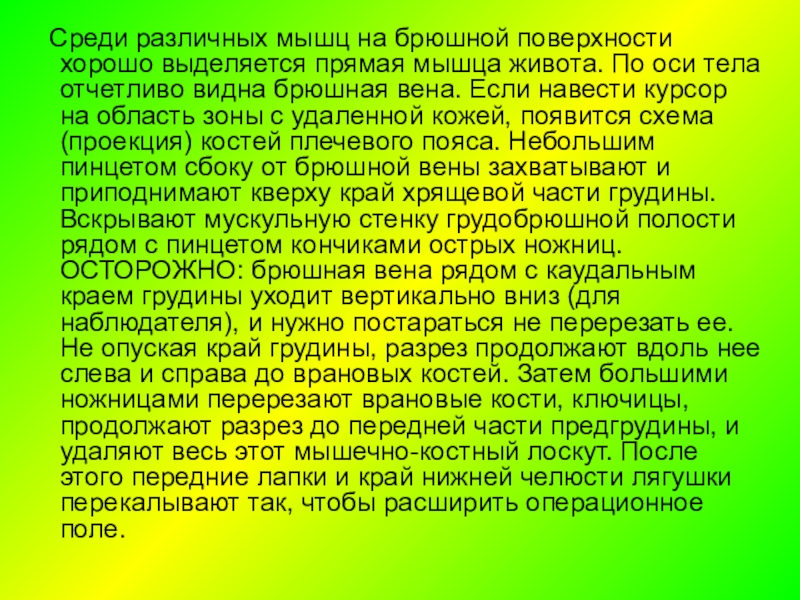 мышца живота. По оси тела отчетливо видна брюшная вена. Если навести курсор на область зоны с удаленной кожей, появится схема (проекция) костей плечевого пояса. Небольшим пинцетом сбоку от брюшной вены захватывают и приподнимают кверху край хрящевой части грудины. Вскрывают мускульную стенку грудобрюшной полости рядом с пинцетом кончиками острых ножниц. ОСТОРОЖНО: брюшная вена рядом с каудальным краем грудины уходит вертикально вниз (для наблюдателя), и нужно постараться не перерезать ее. Не опуская край грудины, разрез продолжают вдоль нее слева и справа до врановых костей. Затем большими ножницами перерезают врановые кости, ключицы, продолжают разрез до передней части предгрудины, и удаляют весь этот мышечно-костный лоскут. После этого передние лапки и край нижней челюсти лягушки перекалывают так, чтобы расширить операционное поле.