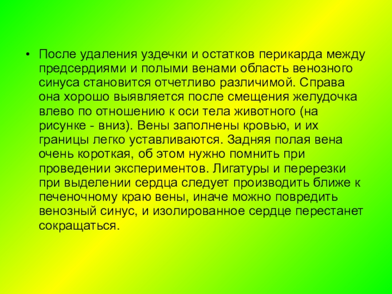 область венозного синуса становится отчетливо различимой. Справа она хорошо выявляется после смещения желудочка влево по отношению к оси тела животного (на рисунке - вниз). Вены заполнены кровью, и их границы легко уставливаются. Задняя полая вена очень короткая, об этом нужно помнить при проведении экспериментов. Лигатуры и перерезки при выделении сердца следует производить ближе к печеночному краю вены, иначе можно повредить венозный синус, и изолированное сердце перестанет сокращаться.