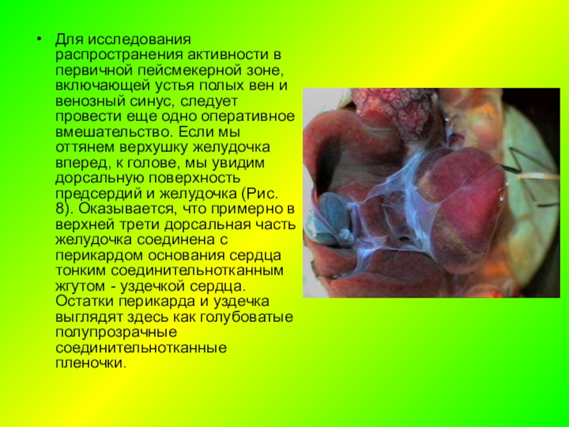 вен и венозный синус, следует провести еще одно оперативное вмешательство. Если мы оттянем верхушку желудочка вперед, к голове, мы увидим дорсальную поверхность предсердий и желудочка (Рис. 8). Оказывается, что примерно в верхней трети дорсальная часть желудочка соединена с перикардом основания сердца тонким соединительнотканным жгутом - уздечкой сердца. Остатки перикарда и уздечка выглядят здесь как голубоватые полупрозрачные соединительнотканные пленочки.