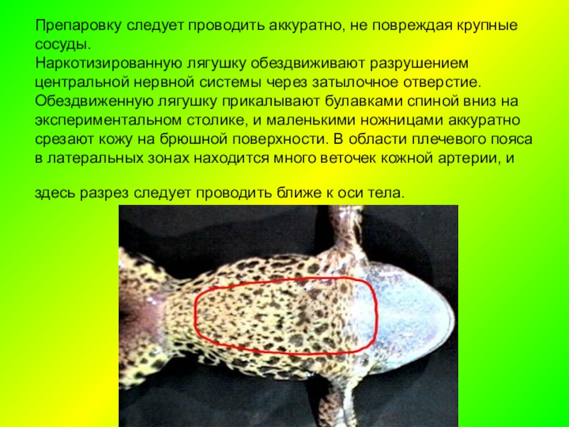 разрушением центральной нервной системы через затылочное отверстие. Обездвиженную лягушку прикалывают булавками спиной вниз на экспериментальном столике, и маленькими ножницами аккуратно срезают кожу на брюшной поверхности. В области плечевого пояса в латеральных зонах находится много веточек кожной артерии, и здесь разрез следует проводить ближе к оси тела.
