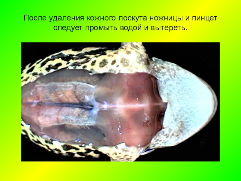 Слайд 4После удаления кожного лоскута ножницы и пинцет следует промыть водой и