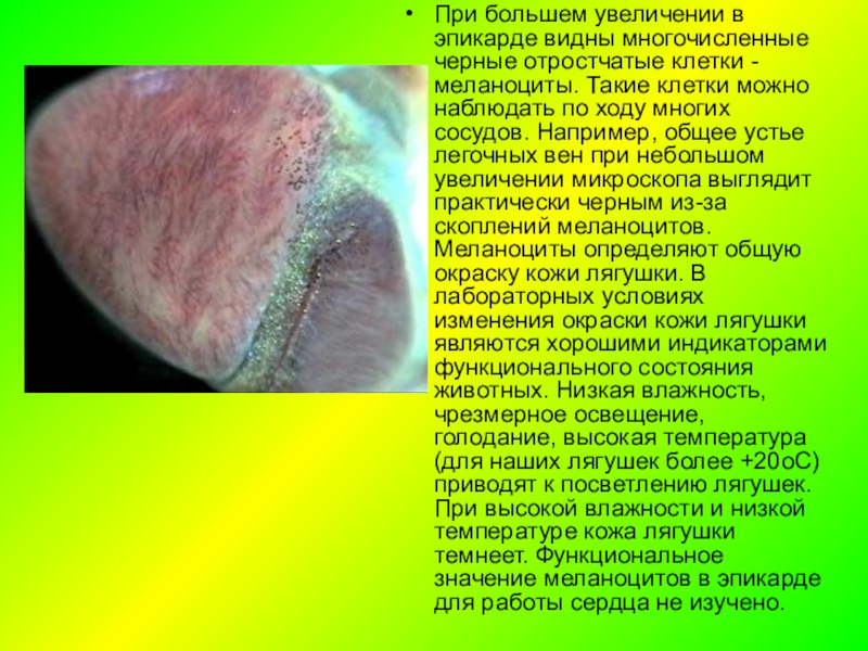 меланоциты. Такие клетки можно наблюдать по ходу многих сосудов. Например, общее устье легочных вен при небольшом увеличении микроскопа выглядит практически черным из-за скоплений меланоцитов. Меланоциты определяют общую окраску кожи лягушки. В лабораторных условиях изменения окраски кожи лягушки являются хорошими индикаторами функционального состояния животных. Низкая влажность, чрезмерное освещение, голодание, высокая температура (для наших лягушек более +20оC) приводят к посветлению лягушек. При высокой влажности и низкой температуре кожа лягушки темнеет. Функциональное значение меланоцитов в эпикарде для работы сердца не изучено.