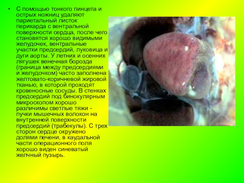 с вентральной поверхности сердца, после чего становятся хорошо видимыми желудочек, вентральные участки предсердий, луковица и дуги аорты. У летних и осенних лягушек венечная борозда (граница между предсердиями и желудочком) часто заполнена желтовато-коричневой жировой тканью, в которой проходят кровеносные сосуды. В стенках предсердий под бинокулярным микроскопом хорошо различимы светлые тяжи - пучки мышечных волокон на внутренней поверхности предсердий (трабекулы). С трех сторон сердце окружено долями печени, в каудальной части операционного поля хорошо виден синеватый желчный пузырь.