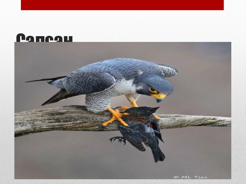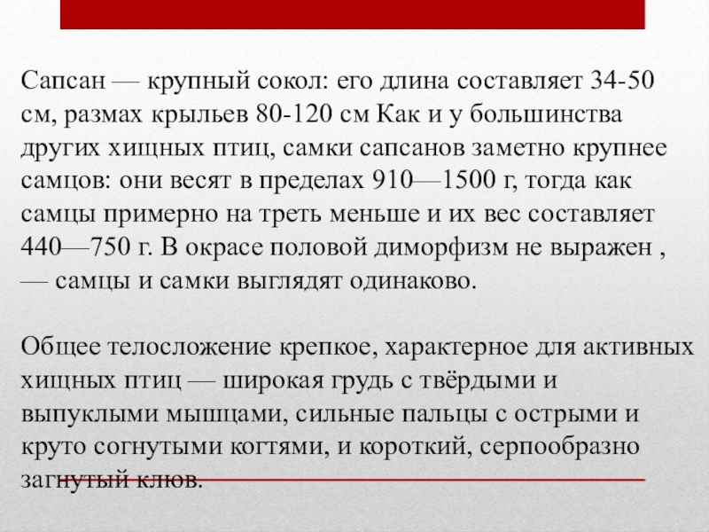 Слайд 15Сапсан — крупный сокол: его длина составляет 34-50 см, размах крыльев