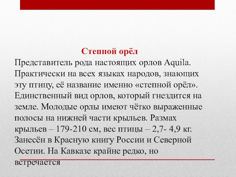 знающих эту птицу, её название именно «степной орёл». Единственный вид орлов, который гнездится на земле. Молодые орлы имеют чётко выраженные полосы на нижней части крыльев. Размах крыльев – 179-210 см, вес птицы – 2,7- 4,9 кг. Занесён в Красную книгу России и Северной Осетии. На Кавказе крайне редко, но встречается