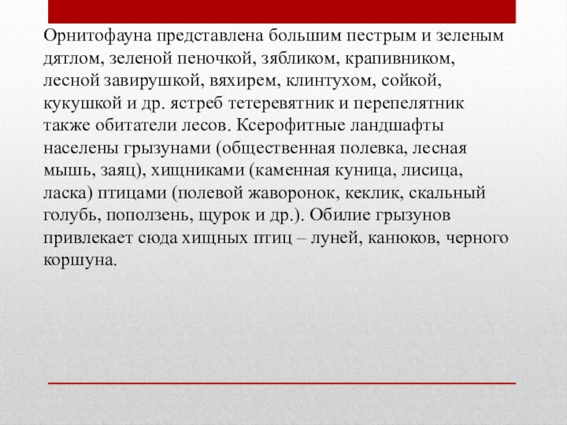 лесной завирушкой, вяхирем, клинтухом, сойкой, кукушкой и др. ястреб тетеревятник и перепелятник также обитатели лесов. Ксерофитные ландшафты населены грызунами (общественная полевка, лесная мышь, заяц), хищниками (каменная куница, лисица, ласка) птицами (полевой жаворонок, кеклик, скальный голубь, поползень, щурок и др.). Обилие грызунов привлекает сюда хищных птиц – луней, канюков, черного коршуна.