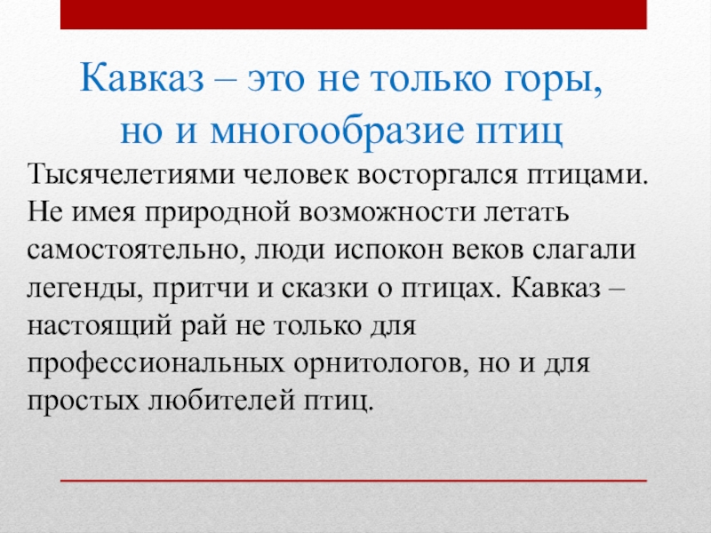 восторгался птицами. Не имея природной возможности летать самостоятельно, люди испокон веков слагали легенды, притчи и сказки о птицах. Кавказ – настоящий рай не только для профессиональных орнитологов, но и для простых любителей птиц.
