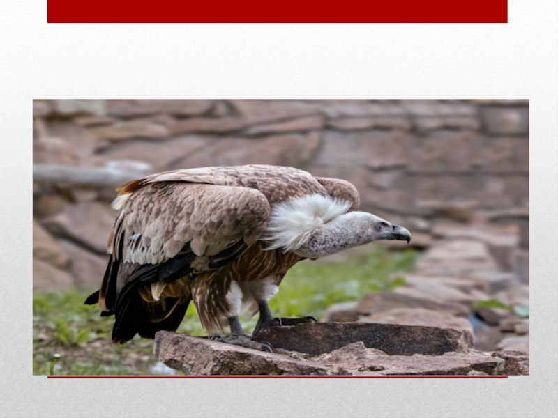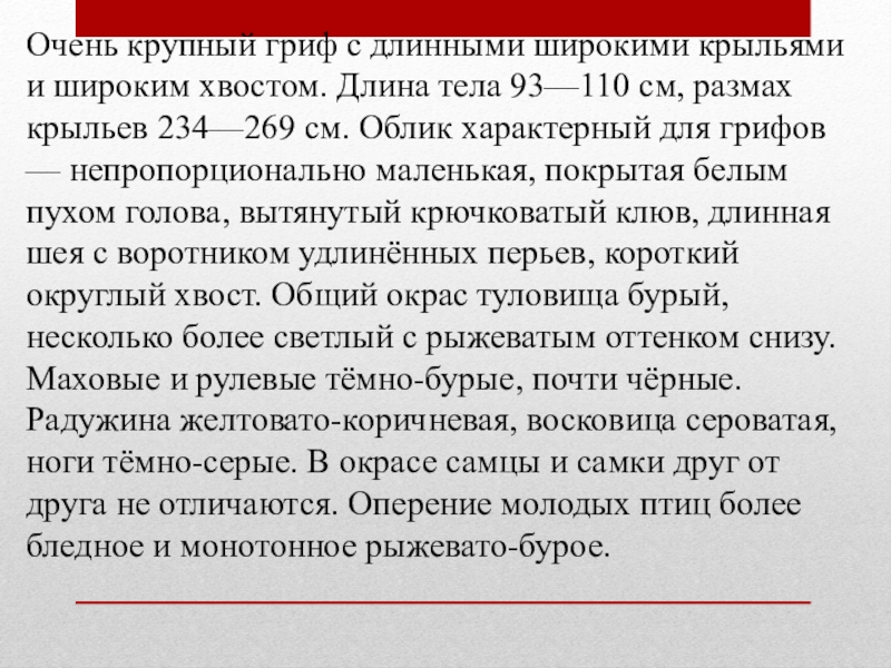 Слайд 12Очень крупный гриф с длинными широкими крыльями и широким хвостом. Длина