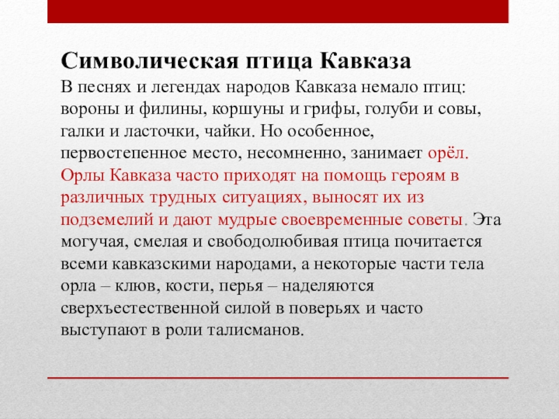 Орлы Кавказа часто приходят на помощь героям в различных трудных ситуациях, выносят их из подземелий и дают мудрые своевременные советы. Эта могучая, смелая и свободолюбивая птица почитается всеми кавказскими народами, а некоторые части тела орла – клюв, кости, перья – наделяются сверхъестественной силой в поверьях и часто выступают в роли талисманов.