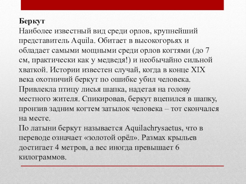 По латыни беркут называется Aquilachrysaetus, что в переводе означает «золотой орёл». Размах крыльев достигает 4 метров, а вес иногда превышает 6 килограммов.