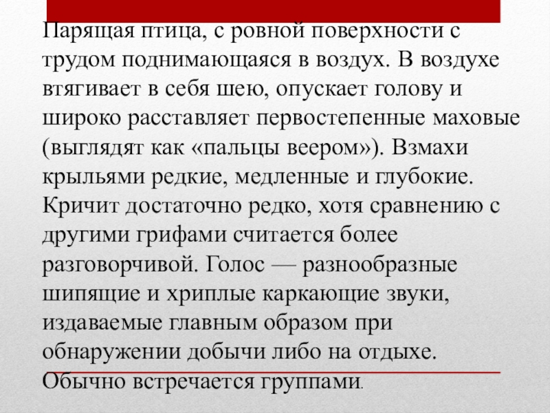 Слайд 13Парящая птица, с ровной поверхности с трудом поднимающаяся в воздух. В