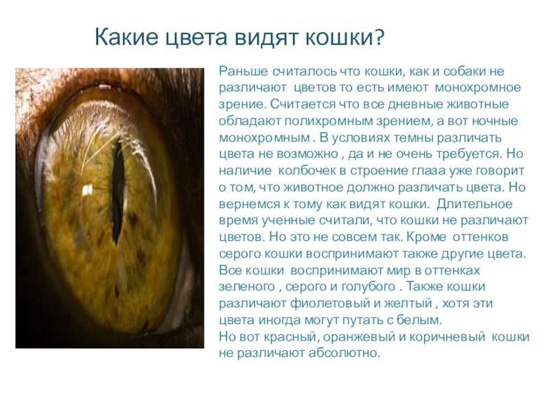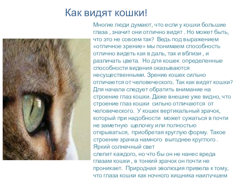 они отлично видят . Но может быть, что это не совсем так? Ведь под выражением «отличное зрение» мы понимаем способность отлично видеть как в даль, так и вблизи , и различать цвета. Но для кошек определенные способности видения оказываются несущественными. Зрение кошек сильно отличается от человеческого. Так как видят кошки? Для начала следует обратить внимание на строение глаз кошки. Даже внешне уже видно, что строение глаз кошки сильно отличаются от человеческого. У кошек вертикальный зрачок, который при надобности может сужаться в почти не заметную щелочку или полностью открываться, приобретая круглую форму. Такое строение зрачка намного выгоднее круглого . Яркий солнечный свет