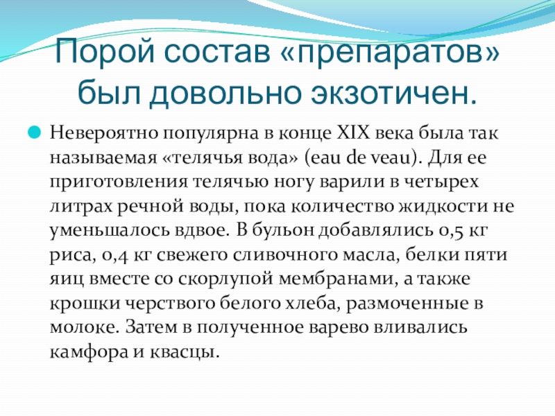 Порой состав «препаратов» был довольно экзотичен. Невероятно популярна в конце XIX века была так называемая «телячья вода»