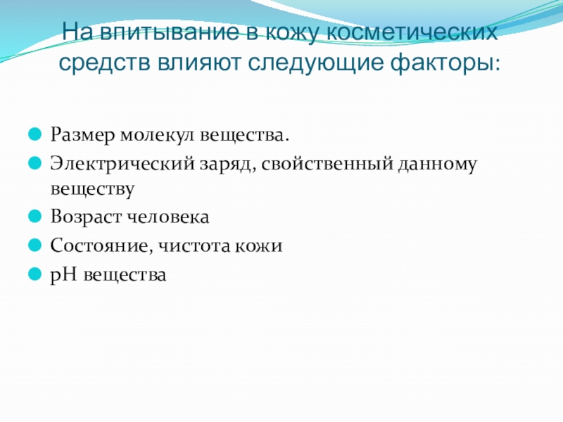 На впитывание в кожу косметических средств влияют следующие факторы: Размер молекул вещества.Электрический заряд, свойственный данному веществу Возраст