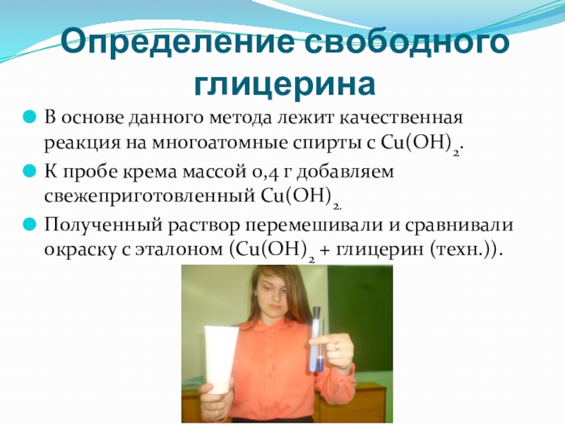 Определение свободного глицерина В основе данного метода лежит качественная реакция на многоатомные спирты с Cu(OH)2.К пробе крема