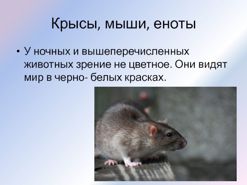 У ночных и вышеперечисленных животных зрение не цветное. Они