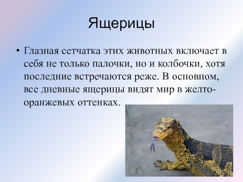 но и колбочки, хотя последние встречаются реже. В основном, все дневные ящерицы видят мир в желто-оранжевых оттенках.