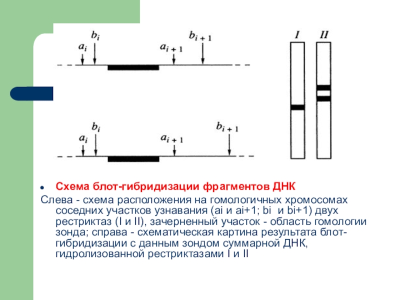 участков узнавания (ai и ai+1; bi и bi+1) двух рестриктаз (I и II), зачерненный участок - область гомологии зонда; справа - схематическая картина результата блот-гибридизации с данным зондом суммарной ДНК, гидролизованной рестриктазами I и II