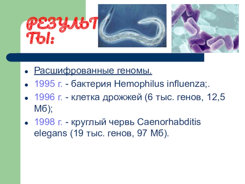 1998 г. - круглый червь Caenorhabditis elegans (19 тыс. генов, 97 Мб).