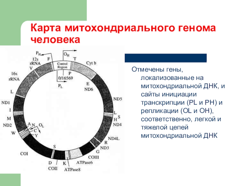 инициации транскрипции (РL и PH) и репликации (OL и OH),соответственно, легкой и тяжелой цепей митохондриальной ДНК