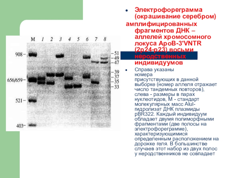 Справа указаны номерааллельных вариантов, присутствующих в данной выборке (номер аллеля отражает число тандемных повторов), слева - размеры в парах нуклеотидов, М - стандарт молекулярных масс Alul-гидролизат ДНК плазмиды pBR322. Каждый индивидуум обладает двумя полиморфными фрагментами (две полосы на электрофореграмме), характеризующимися определенным расположением на дорожке геля. В большинстве случаев этот набор из двух полос у неродственников не совпадает