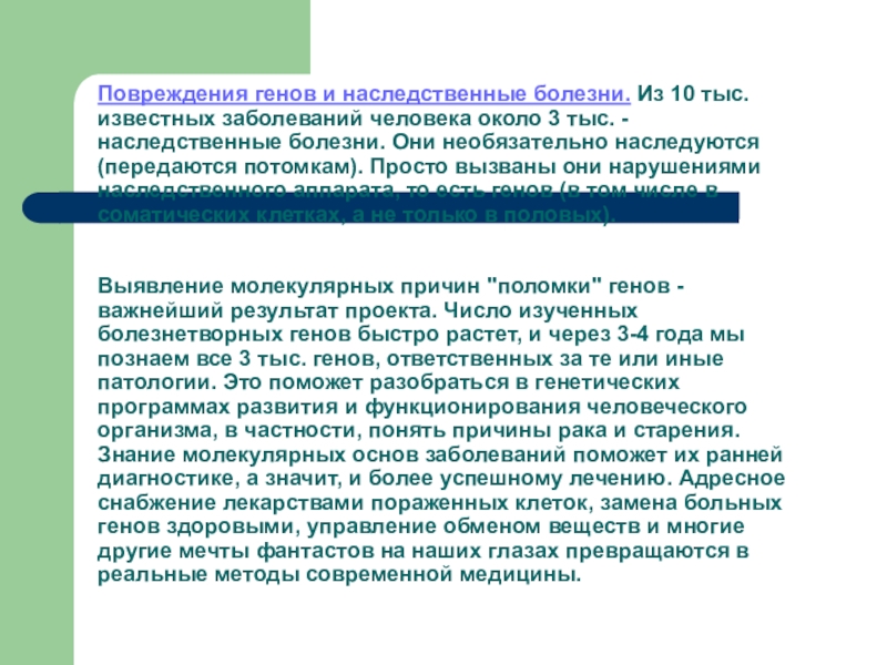 Выявление молекулярных причин "поломки" генов - важнейший результат проекта. Число изученных болезнетворных генов быстро растет, и через 3-4 года мы познаем все 3 тыс. генов, ответственных за те или иные патологии. Это поможет разобраться в генетических программах развития и функционирования человеческого организма, в частности, понять причины рака и старения. Знание молекулярных основ заболеваний поможет их ранней диагностике, а значит, и более успешному лечению. Адресное снабжение лекарствами пораженных клеток, замена больных генов здоровыми, управление обменом веществ и многие другие мечты фантастов на наших глазах превращаются в реальные методы современной медицины.