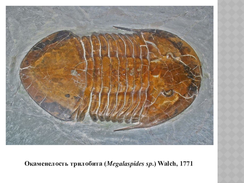 Слайд 39Окаменелость трилобита (Megalaspides sp.) Walch, 1771