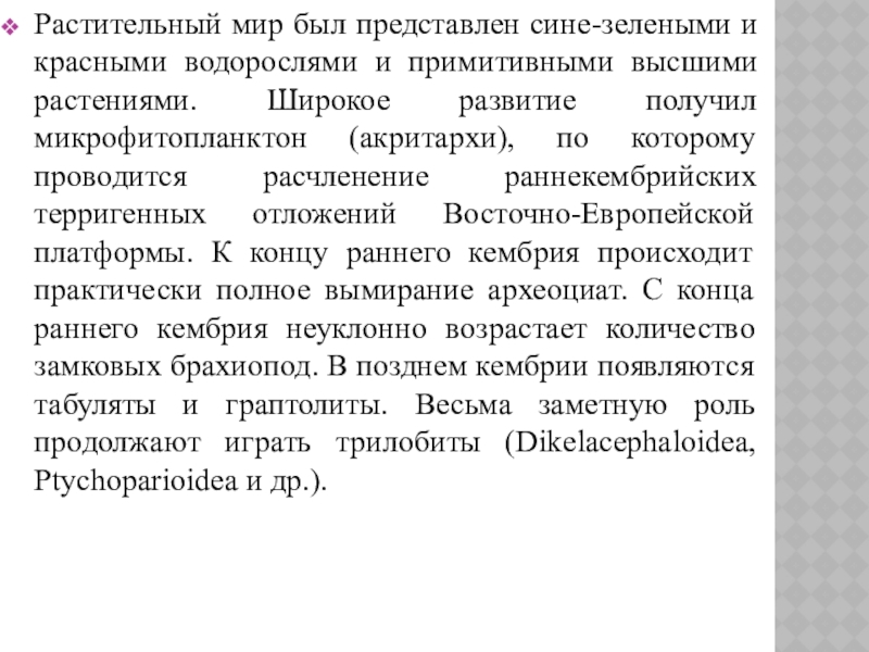растениями. Широкое развитие получил микрофитопланктон (акритархи), по которому проводится расчленение раннекембрийских терригенных отложений Восточно-Европейской платформы. К концу раннего кембрия происходит практически полное вымирание археоциат. С конца раннего кембрия неуклонно возрастает количество замковых брахиопод. В позднем кембрии появляются табуляты и граптолиты. Весьма заметную роль продолжают играть трилобиты (Dikelacephaloidea, Ptychoparioidea и др.).