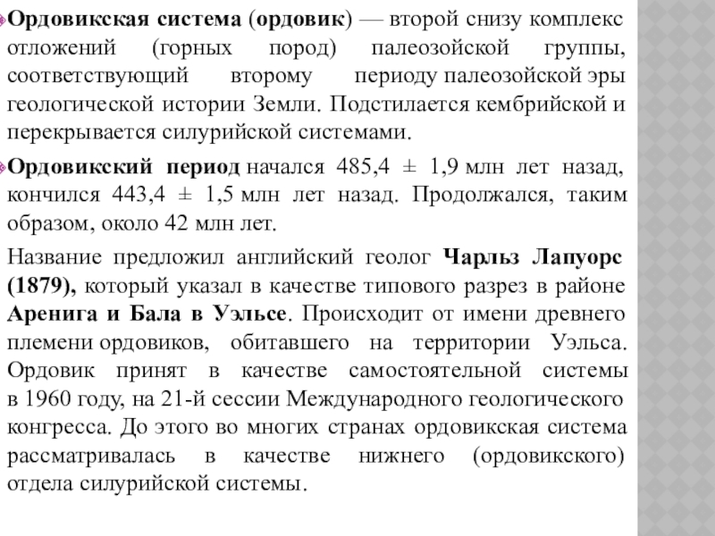 Слайд 28Ордовикская система (ордовик) — второй снизу комплекс отложений (горных пород) палеозойской группы,