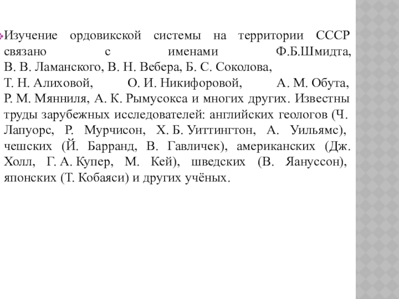 Слайд 29Изучение ордовикской системы на территории СССР связано с именами Ф.Б.Шмидта, В. В. Ламанского, В. Н. Вебера, Б. С. Соколова,