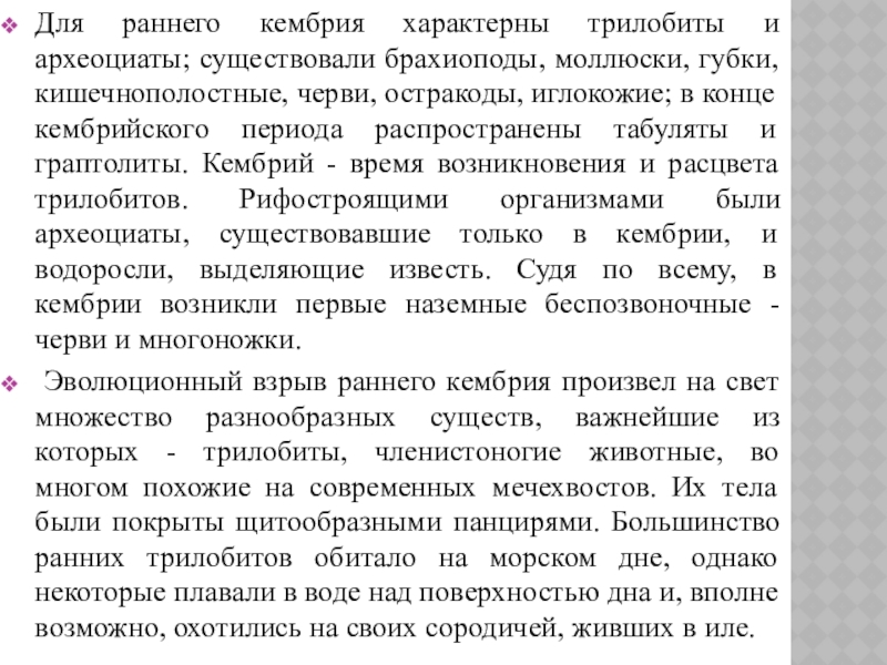 Слайд 10Для раннего кембрия характерны трилобиты и археоциаты; существовали брахиоподы, моллюски, губки,