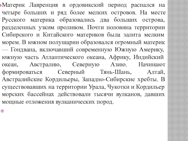 Слайд 31Материк Лавренция в ордовикский период распался на четыре больших и ряд