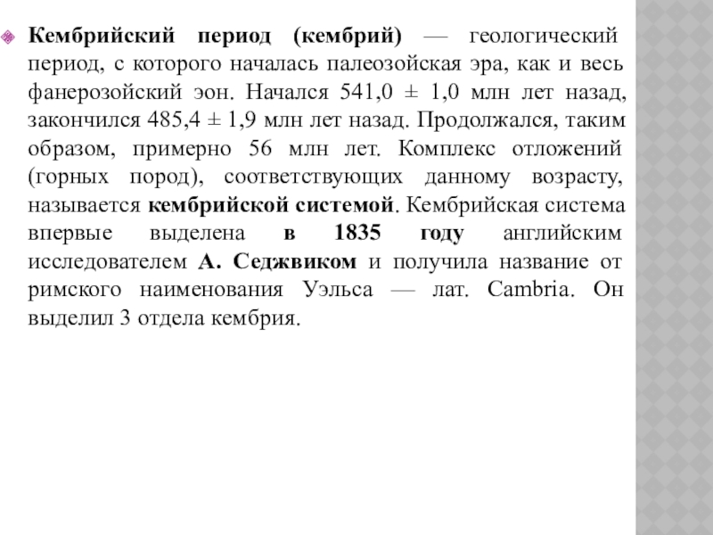 Слайд 2Кембрийский период (кембрий) — геологический период, с которого началась палеозойская эра,