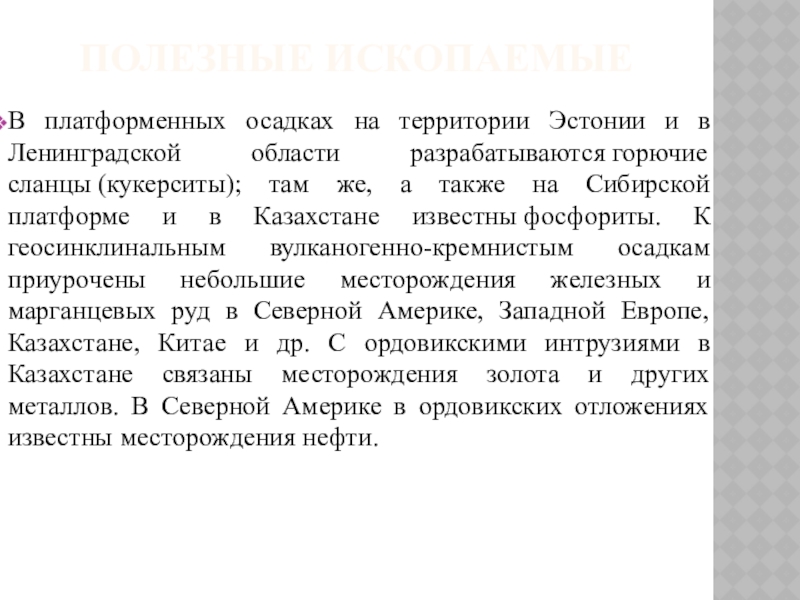 разрабатываются горючие сланцы (кукерситы); там же, а также на Сибирской платформе и в Казахстане известны фосфориты. К геосинклинальным вулканогенно-кремнистым осадкам приурочены небольшие месторождения железных и марганцевых руд в Северной Америке, Западной Европе, Казахстане, Китае и др. С ордовикскими интрузиями в Казахстане связаны месторождения золота и других металлов. В Северной Америке в ордовикских отложениях известны месторождения нефти.