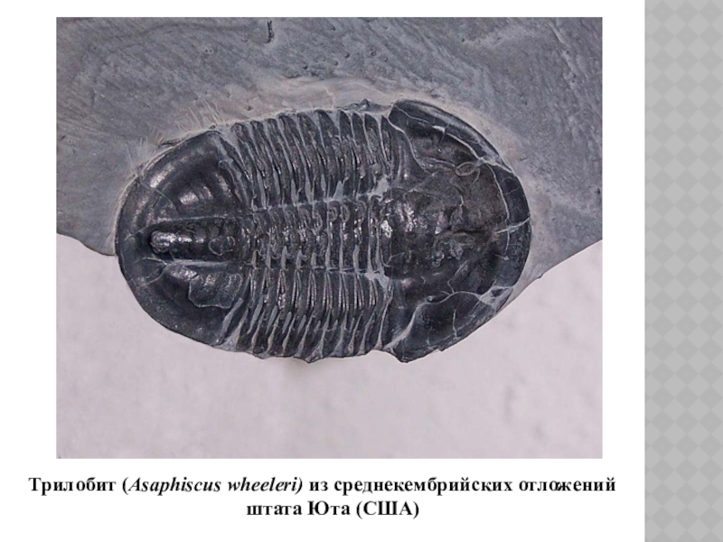 Слайд 13Трилобит (Asaphiscus wheeleri) из среднекембрийских отложений штата Юта (США)
