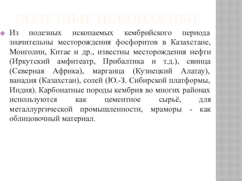Из полезных ископаемых кембрийского периода значительны месторождения фосфоритов в Казахстане,