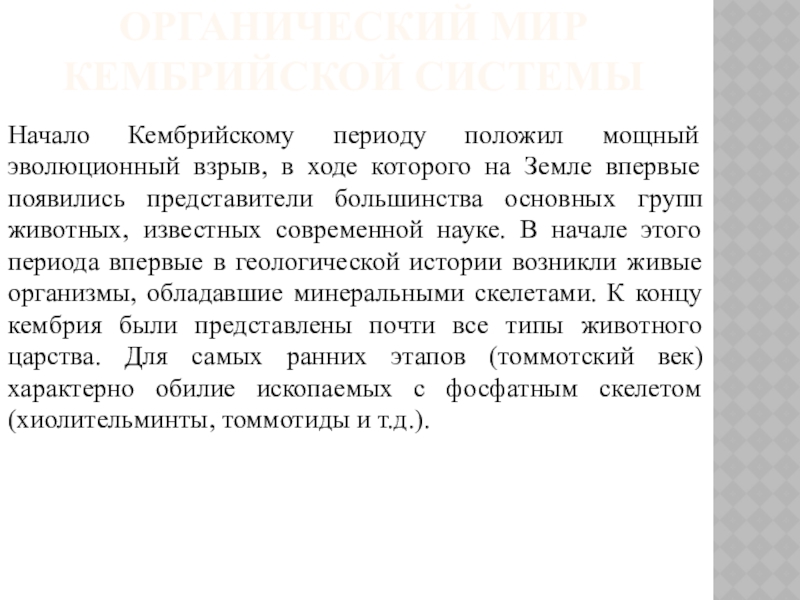 ходе которого на Земле впервые появились представители большинства основных групп животных, известных современной науке. В начале этого периода впервые в геологической истории возникли живые организмы, обладавшие минеральными скелетами. К концу кембрия были представлены почти все типы животного царства. Для самых ранних этапов (томмотский век) характерно обилие ископаемых с фосфатным скелетом (хиолительминты, томмотиды и т.д.).