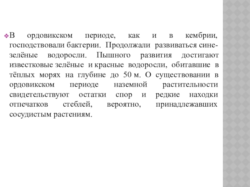 Слайд 36В ордовикском периоде, как и в кембрии, господствовали бактерии. Продолжали развиваться сине-зелёные водоросли.