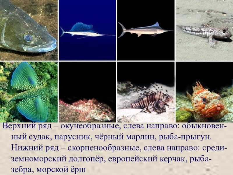 Слайд 13Верхний ряд – окунеобразные, слева направо: обыкновен-ный судак, парусник, чёрный марлин,